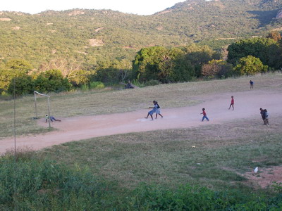 Typisches Bild, das Tor kracht gleich zusammen niemand besitzt Schuhe und der Ball ist aus Stoff und Plastiktüten aber groß und klein haben einen rießen Spaß.